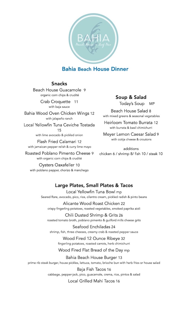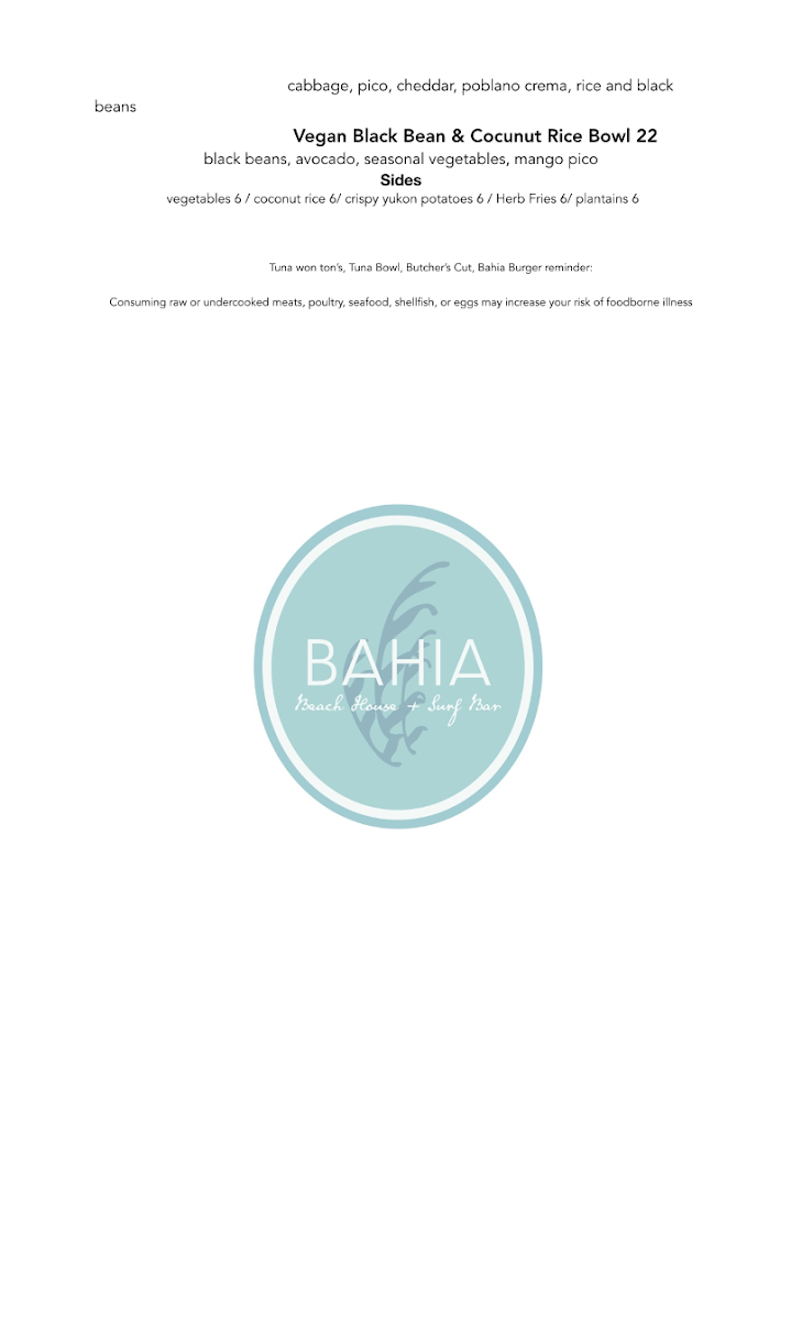 At Bahia Beach House & Surf Bar, the menu is as laid-back and inviting as the Atlantic Beach atmosphere. Whether you're stopping by for a refreshing cocktail after a day in the sun or craving something hearty, the Bahia Beach House & Surf Bar Menu has something for every taste. From fresh seafood dishes that bring the flavors of the coast to life, to mouth-watering burgers and tacos, you'll find options that make it easy to kick back and relax. Pair your meal with a tropical drink or choose from an array of craft beers to complement your time at this beachside gem. Everything is prepared with the finest ingredients, bringing you a relaxed dining experience that lets you enjoy every bite while watching the waves roll in. The perfect spot for friends, family, and anyone who loves good food in a great setting.
